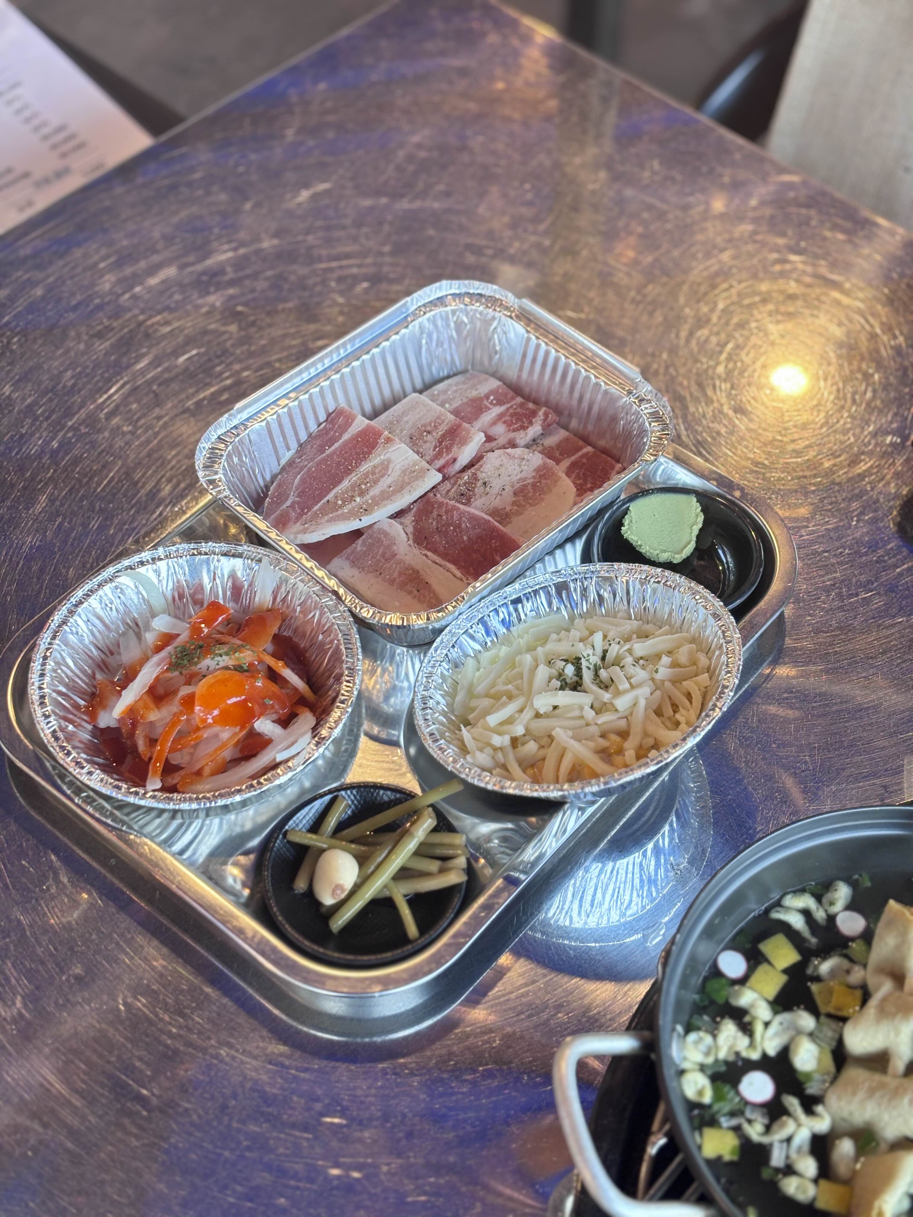 어묵국, 삼겹살, 해산물 반찬까지 기본 세팅이 아주 훌륭했습니다.